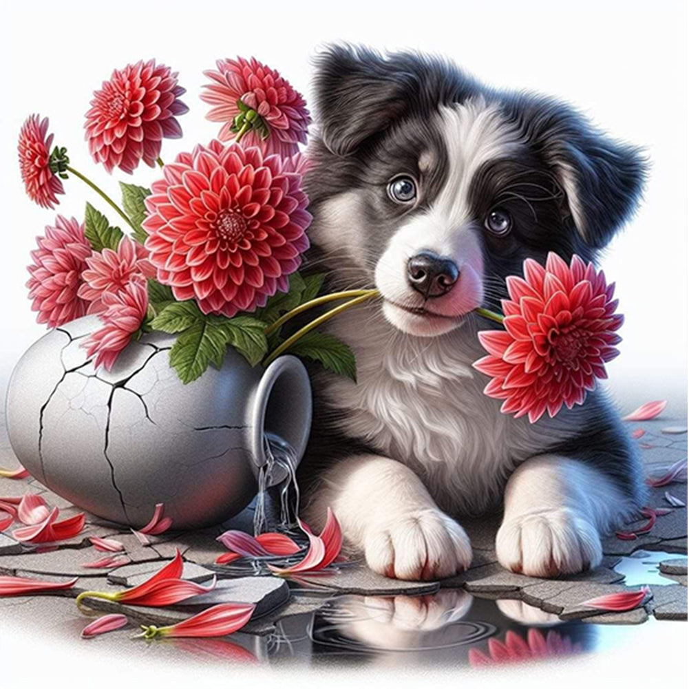 AB Diamond Painting - Full Round - Flowers and Puppy Border Collie (40*40CM)