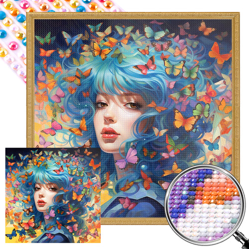 AB Diamond Painting - Full Round - Butterfly and blue-haired beauty (40*40CM)