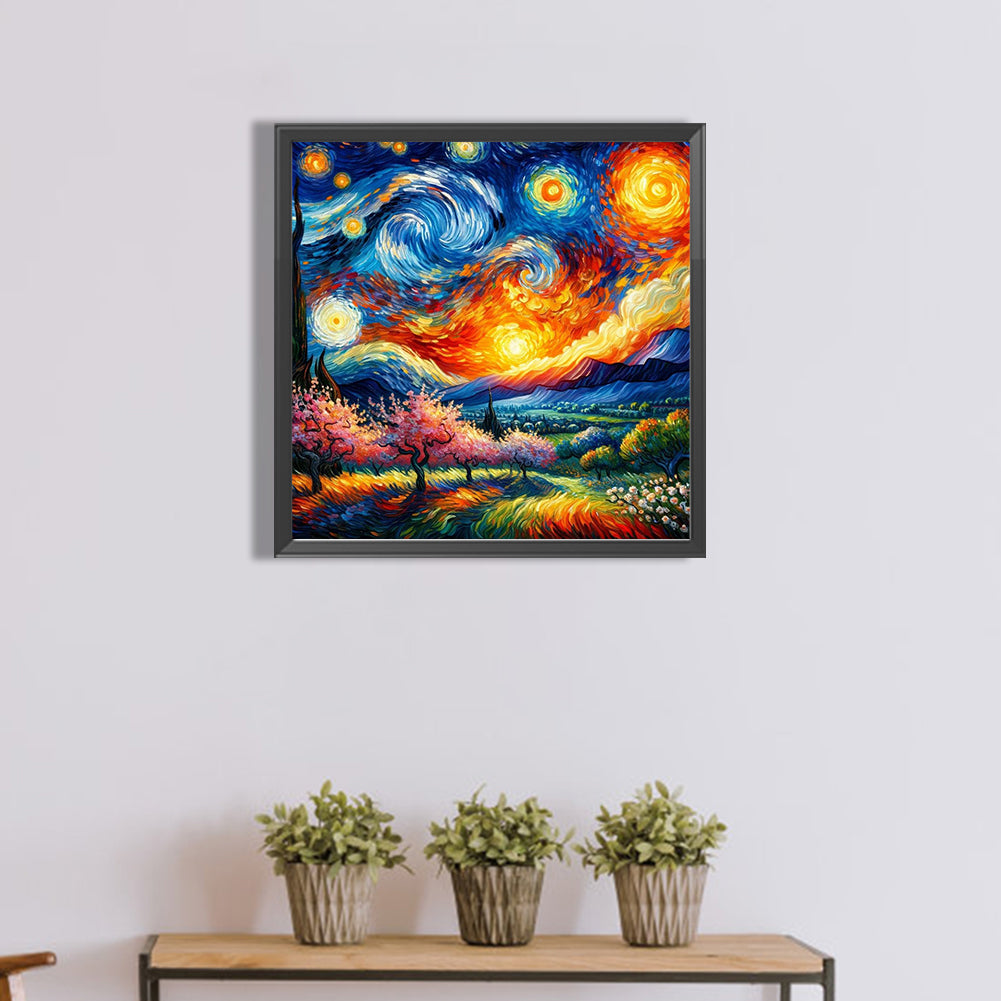 Diamond Painting - Full Round - Colored lead painting of starry sky and countryside (40*40CM)