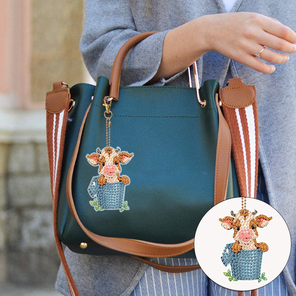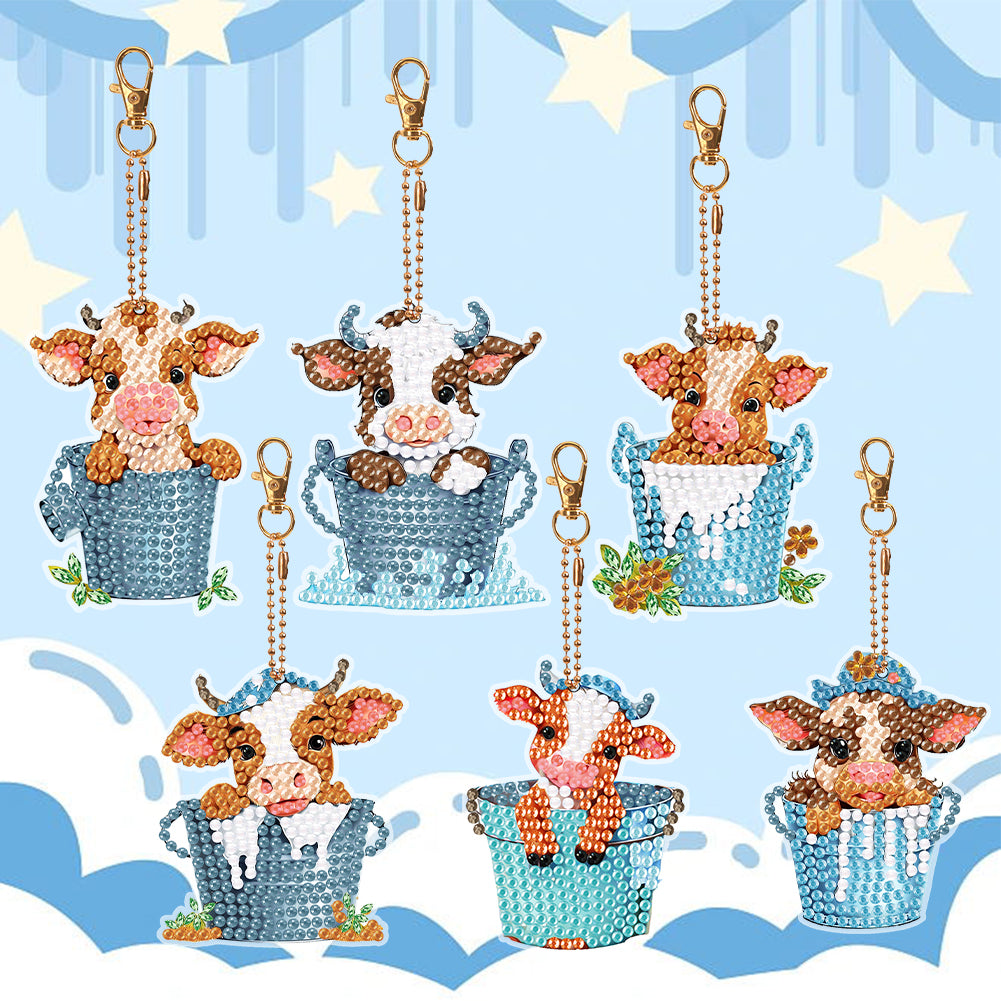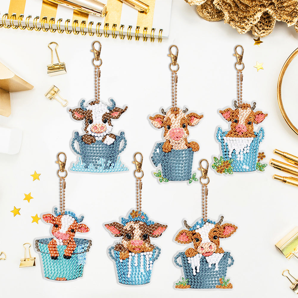 6PCS Double Sided Round Diamond Painting Art Keychain Pendant(Cows in Milk Vats)