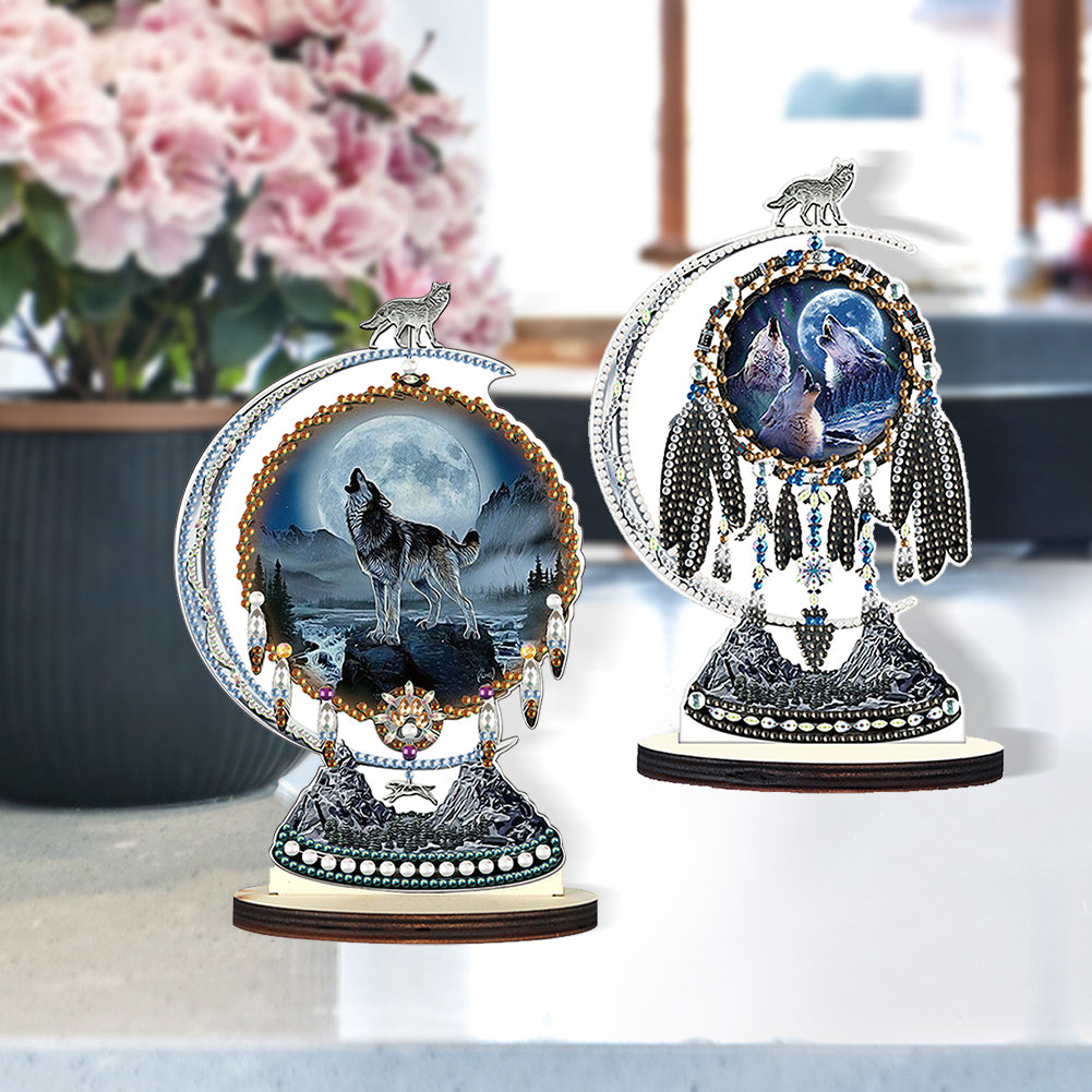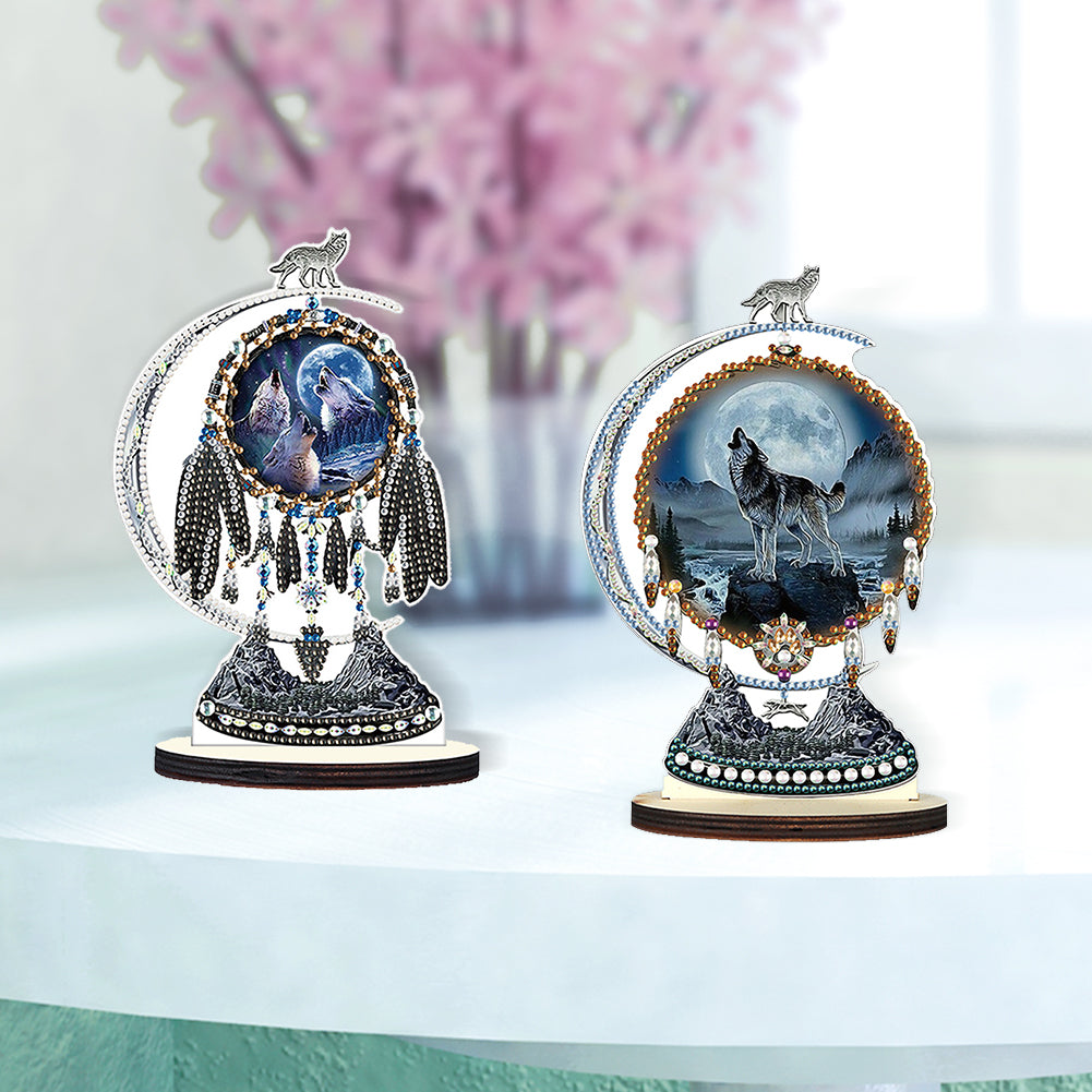 2PCS Wooden Dreamcatcher Wolf Table Top Diamond Painting Decor (#6)