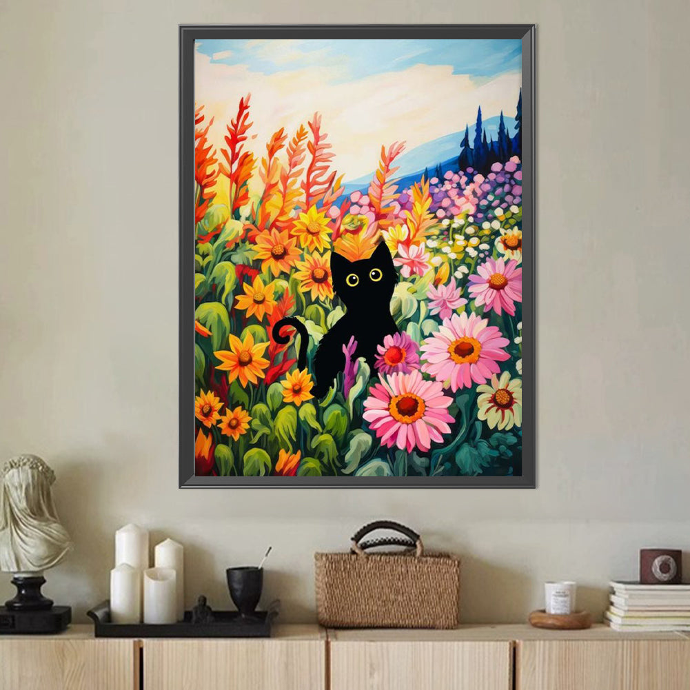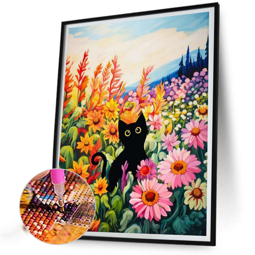 Diamond Painting - Full Round - black cat in flowers (40*50CM)