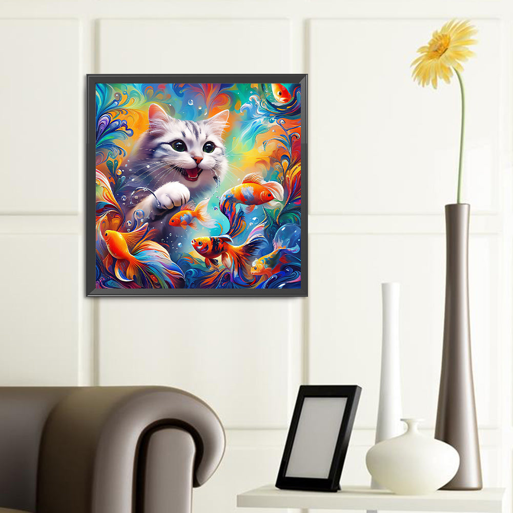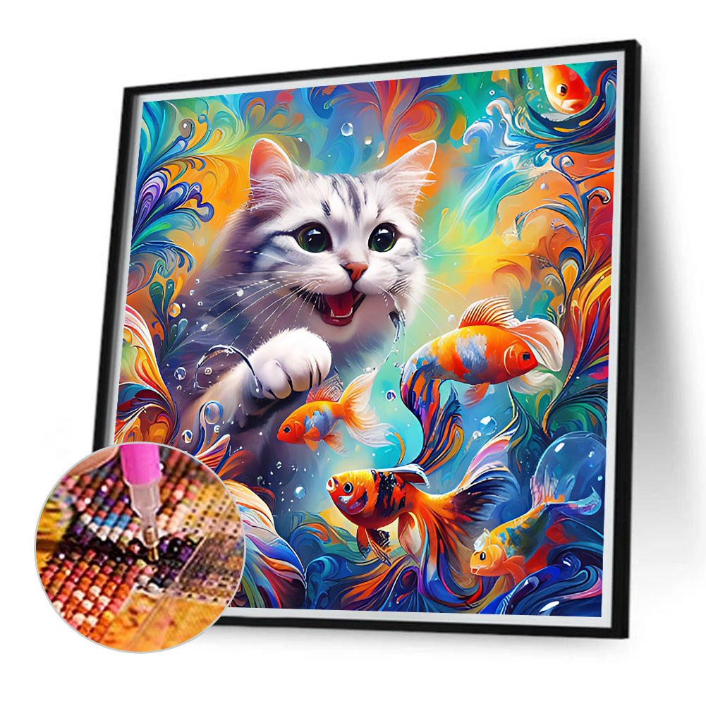 Diamond Painting - Full Round - Goldfish and black and white cat (40*40CM)