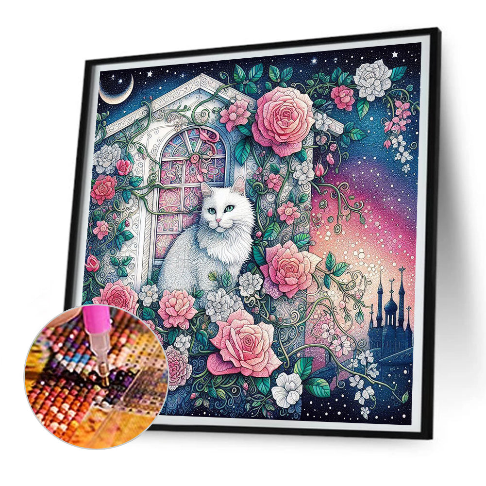 Diamond Painting - Full Round - White cat on rose window (30*30CM)