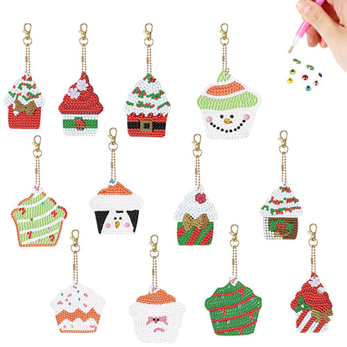 12Pcs Double Side Christmas Cupcake Diamond Painting Art Craft Keychain