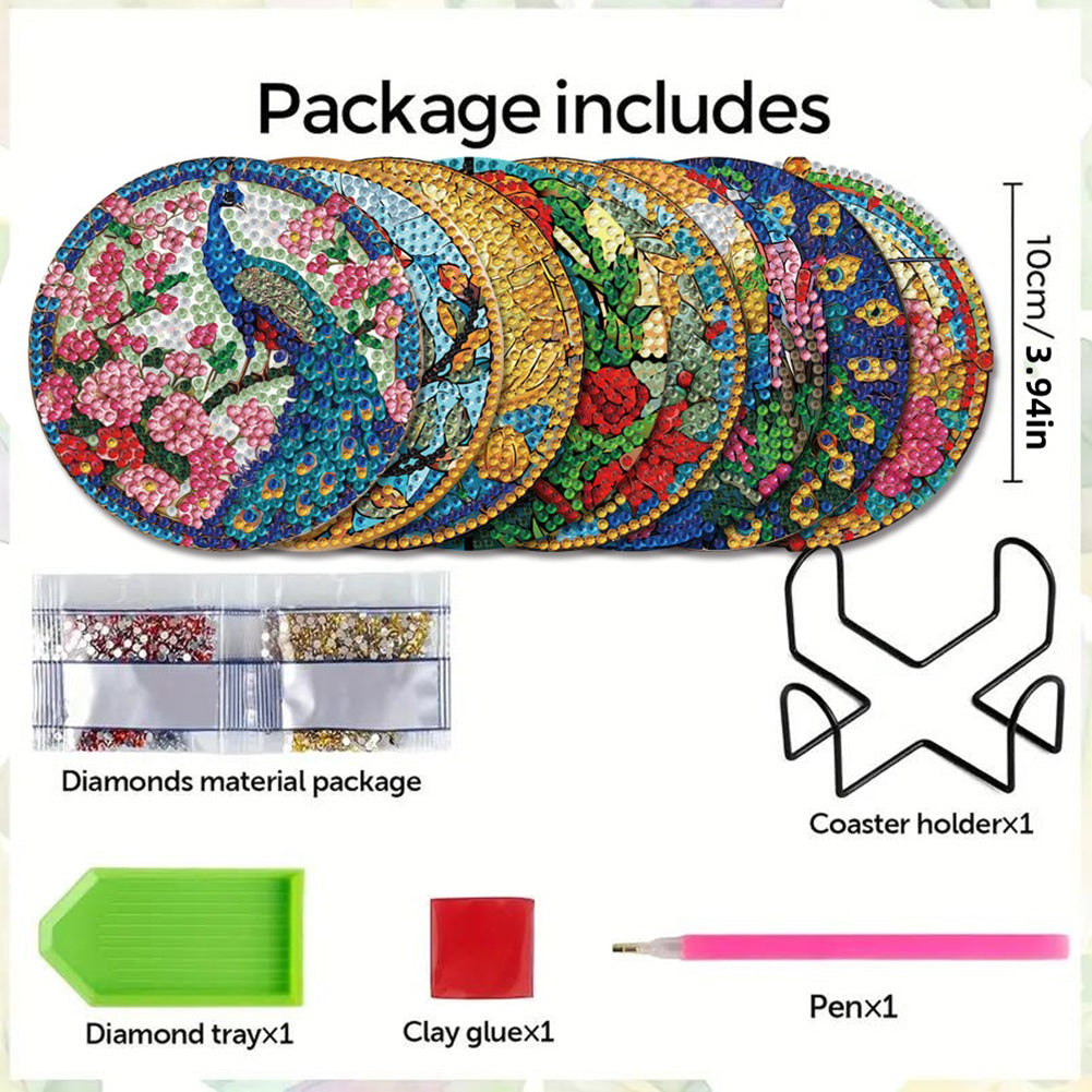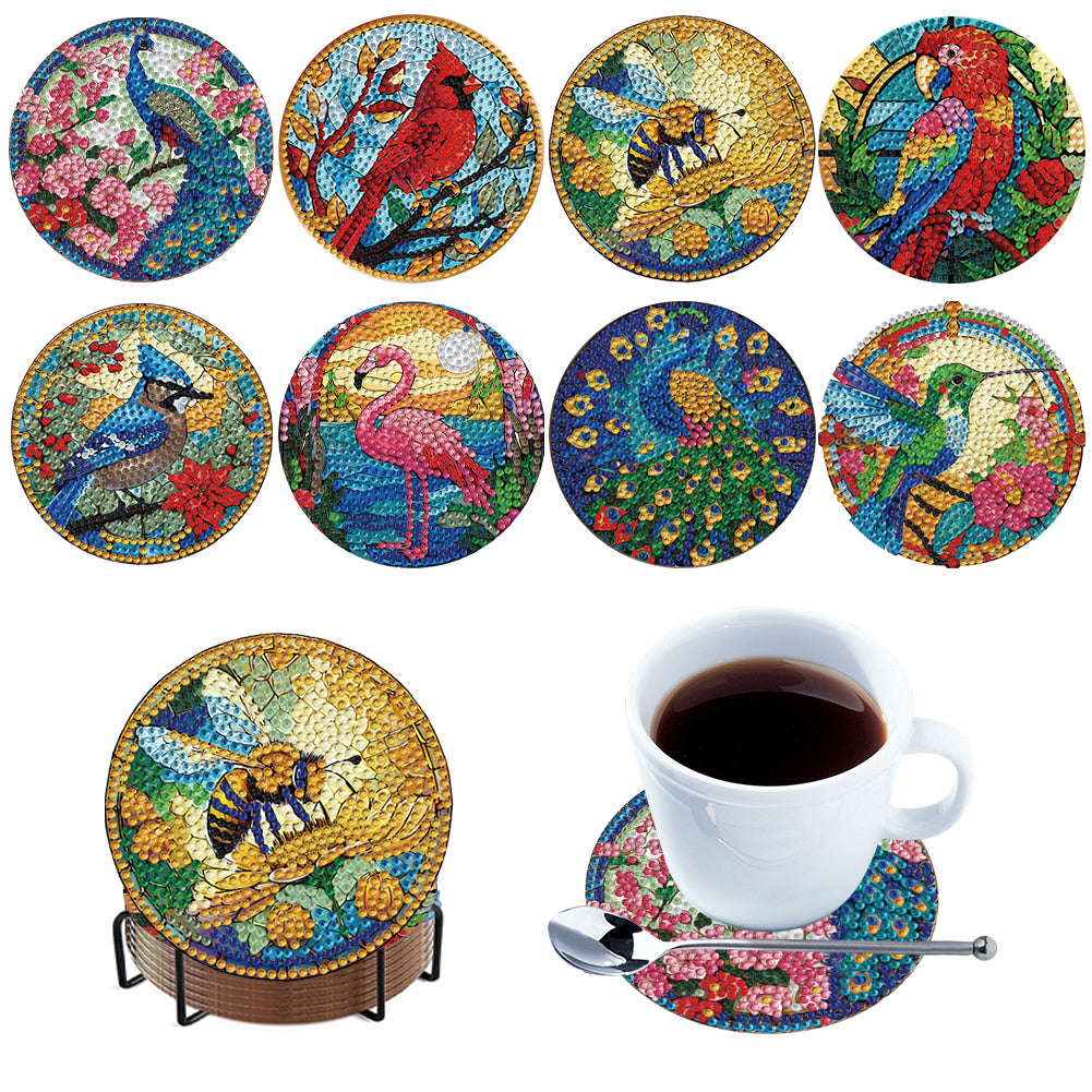 8Pcs Wooden Diamond Painting Coasters 5D Diamond Painting Kits Shining Drink Coasters for Party Decoration