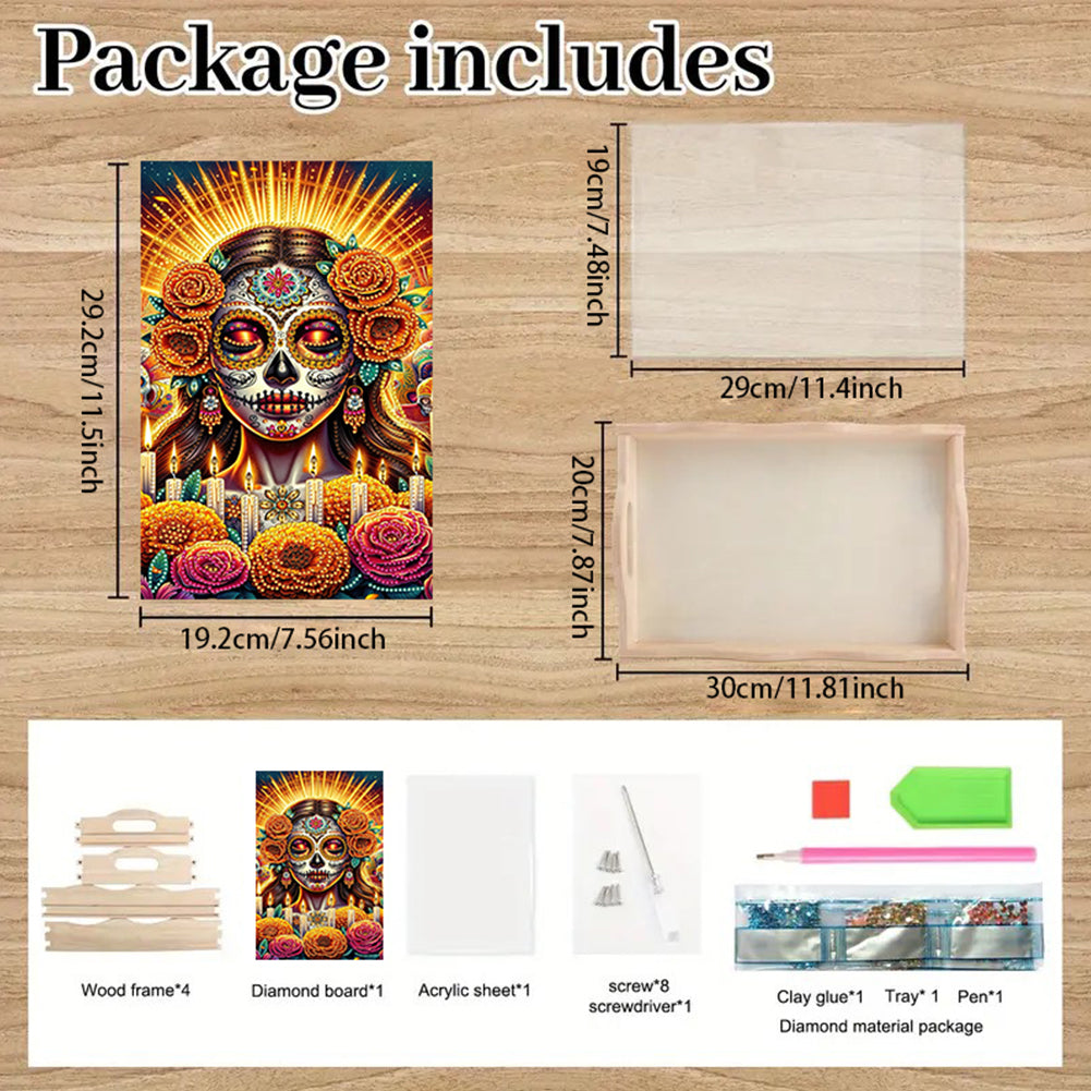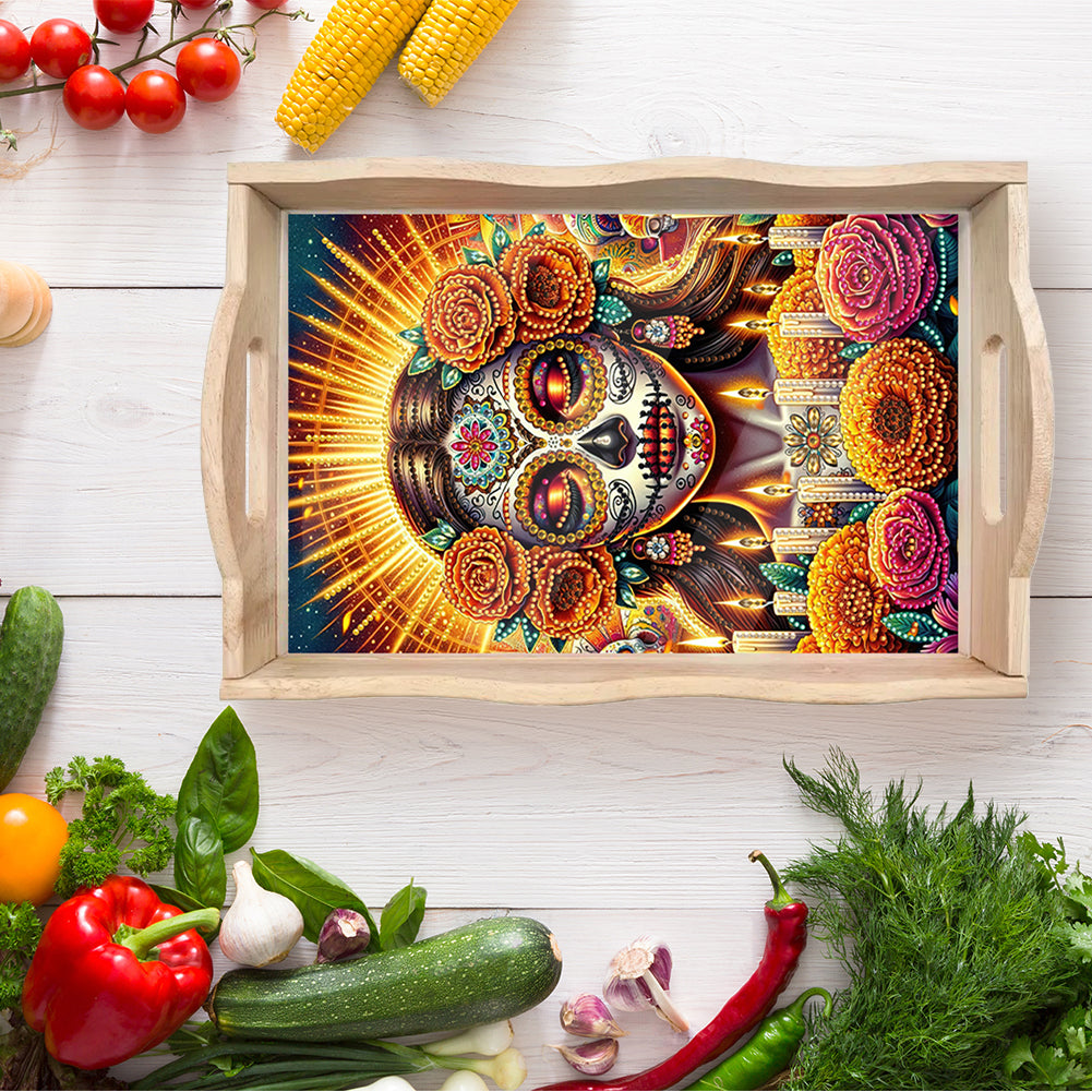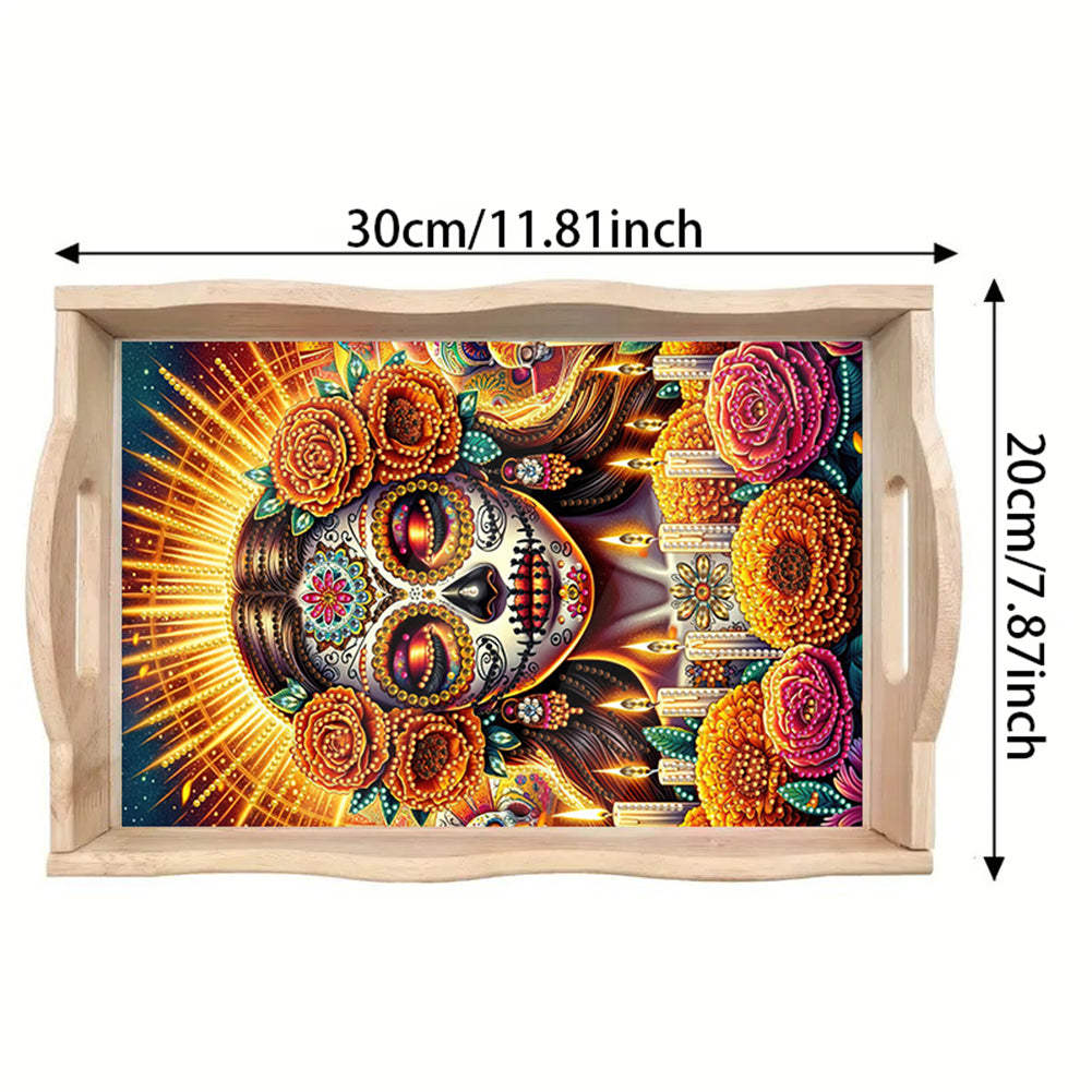 Wooden Horror Girl Diamond Decorative Serving Tray with Handle for Coffee Table