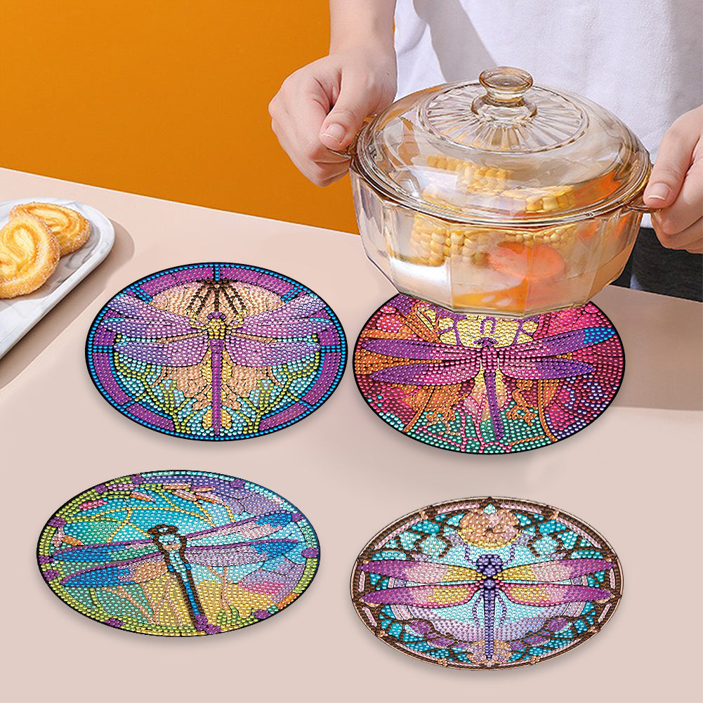 4 PCS Wood Diamond Painted Placemats Kitchen Dish Mat with Holder (Dragonfly)