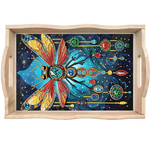 Wooden Dragonfly Diamond Decorative Serving Tray with Handle for Coffee Table