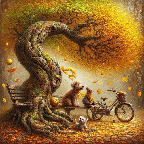 Diamond Painting - Full Round - Dog and family under the big tree in autumn (40*40CM)