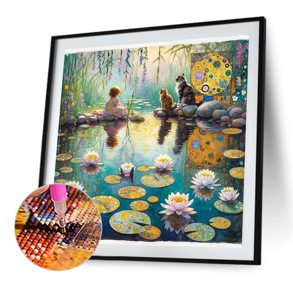Diamond Painting - Full Round - Lotus pond girl and kitten (40*40CM)