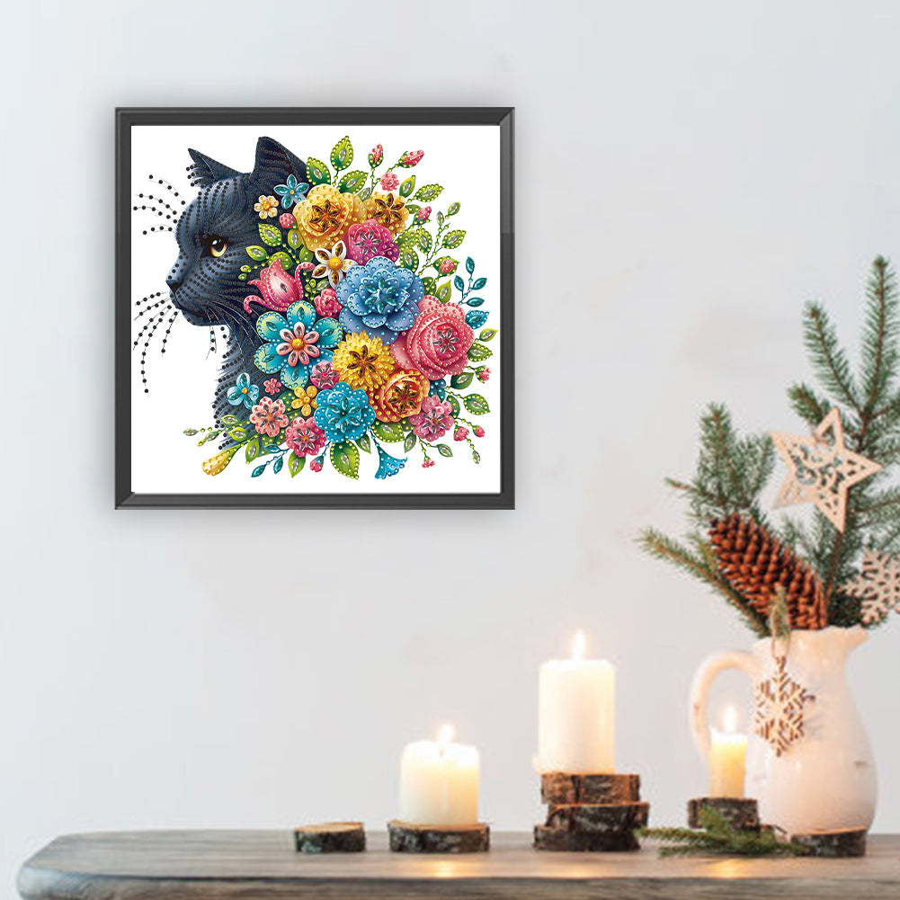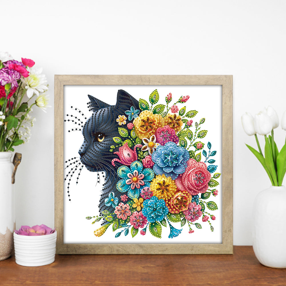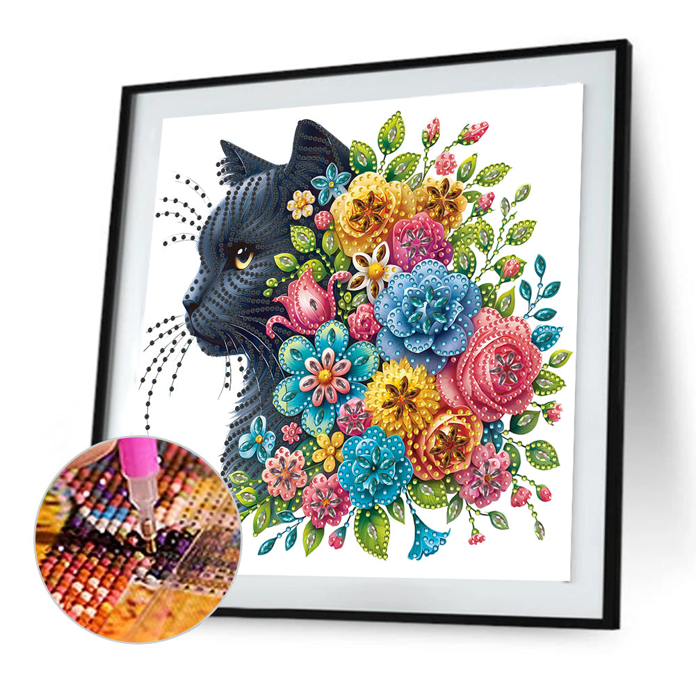 Diamond Painting - Partial Special Shaped - Cat And Flowers (30*30CM)