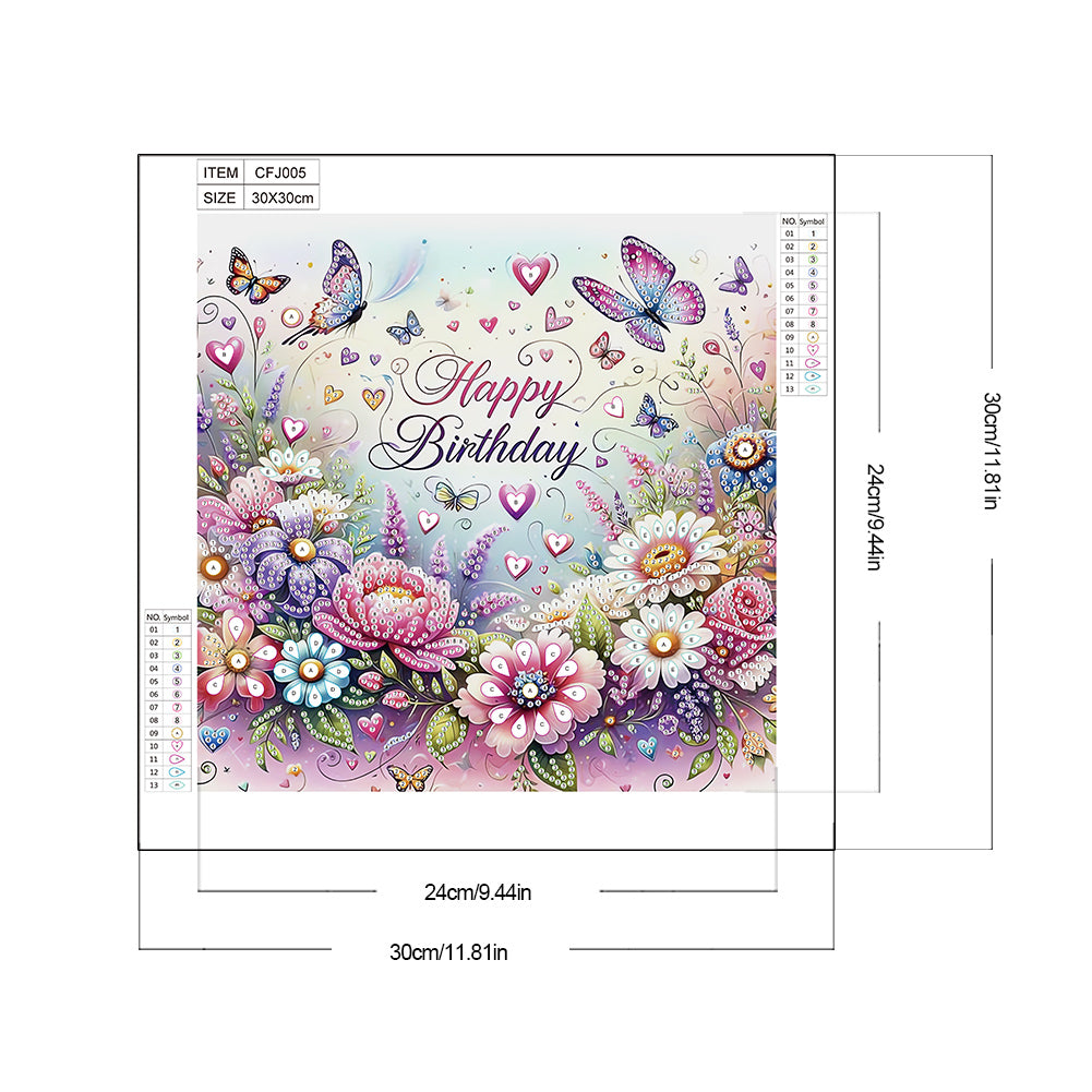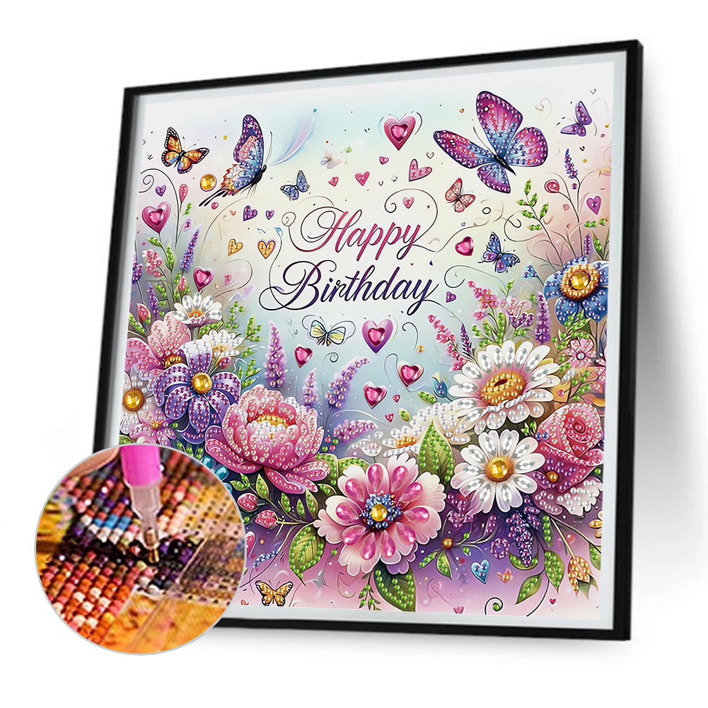 Diamond Painting - Partial Special Shaped - Happy birthday flowers and butterflies (30*30CM)
