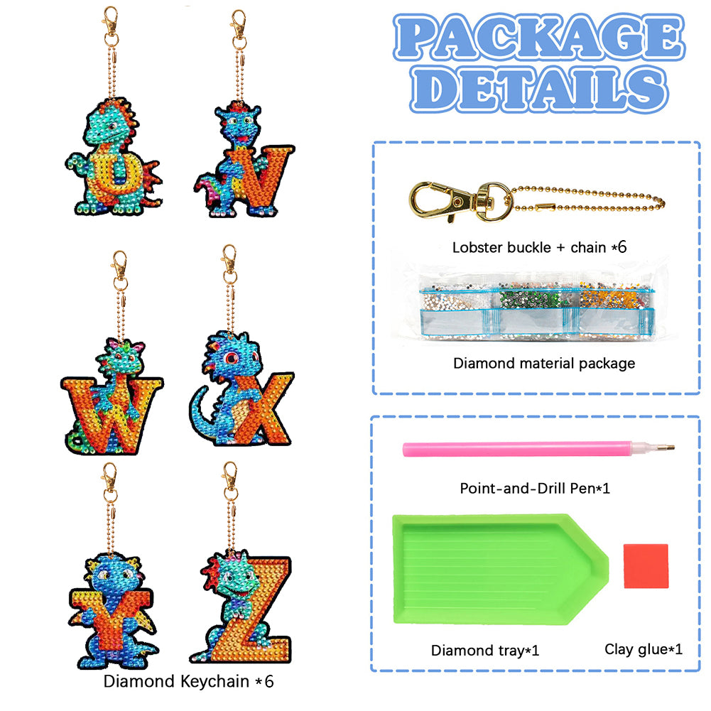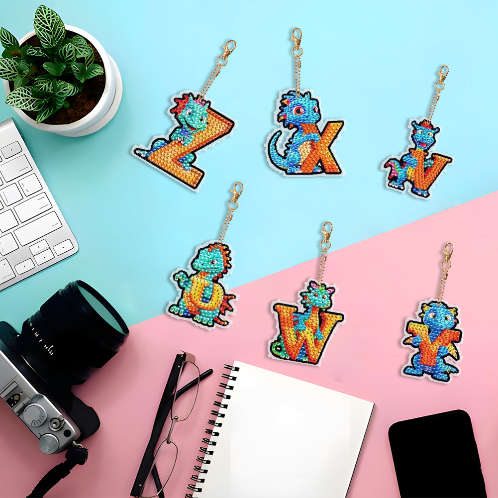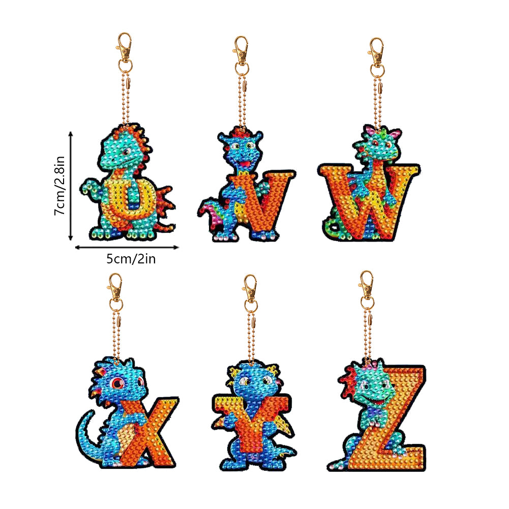 6PCS Double Sided Diamond Painting Art Keychain Pendant (Dinosaur 26 Letters #4)
