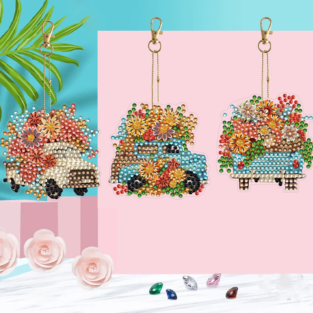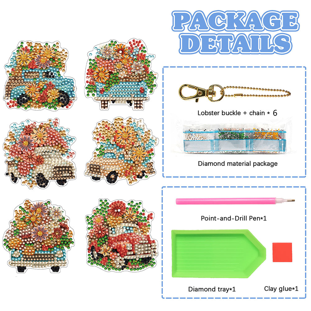 DIY Diamond Art Keychains Cartoon 6pcs (Flower Trolley)