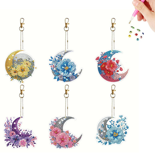 6Pcs Acrylic Double Sided Moon Flower Diamond Painting Keychain for Bag Decor