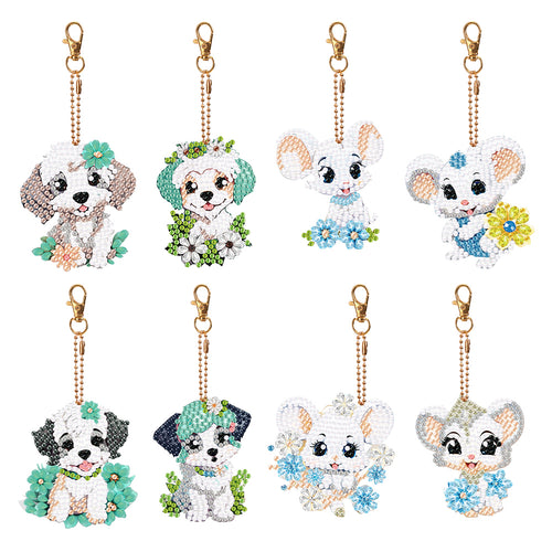 8PCS Double Sided Round Diamond Painting Art Keychain Pendant (Dog and Mouse)