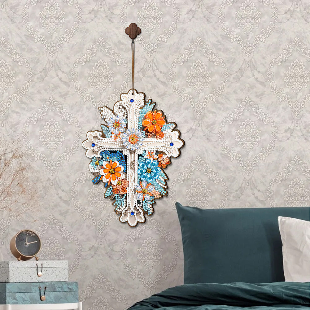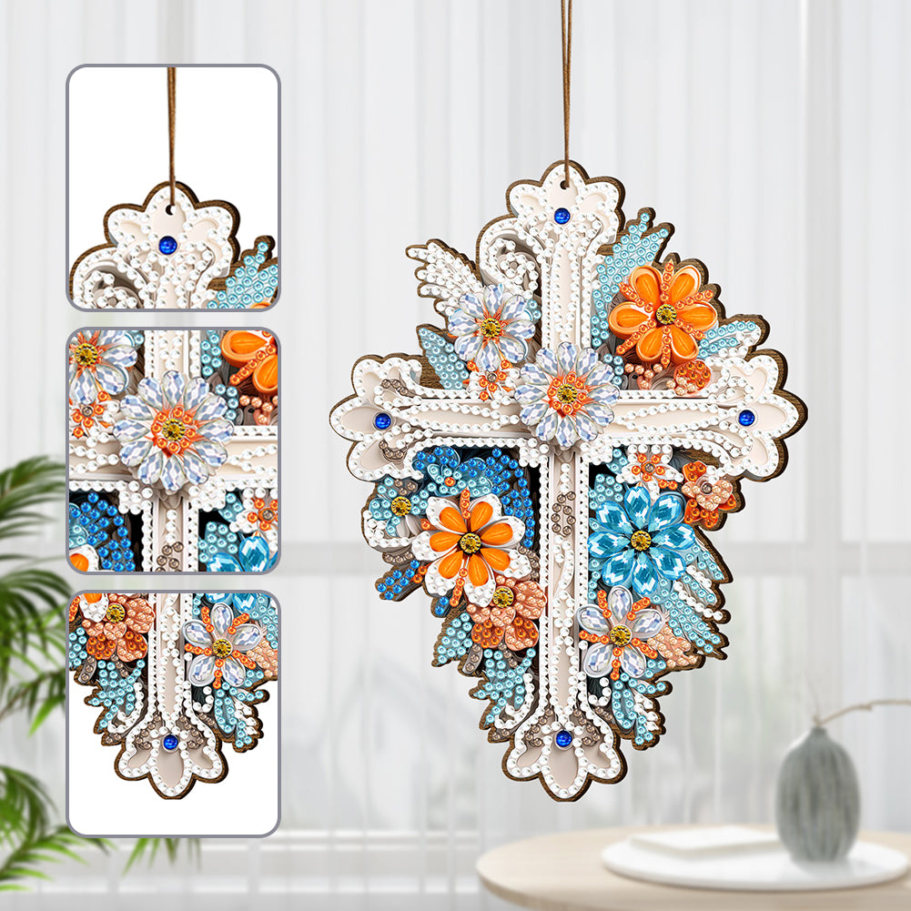 Wooden Cross 5D DIY Diamond Painting Hanging Pendant for Garden Window Decor(02)