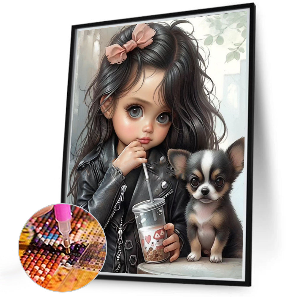 Diamond Painting - Full Round - Girl drinking milk tea with puppy (40*50CM)