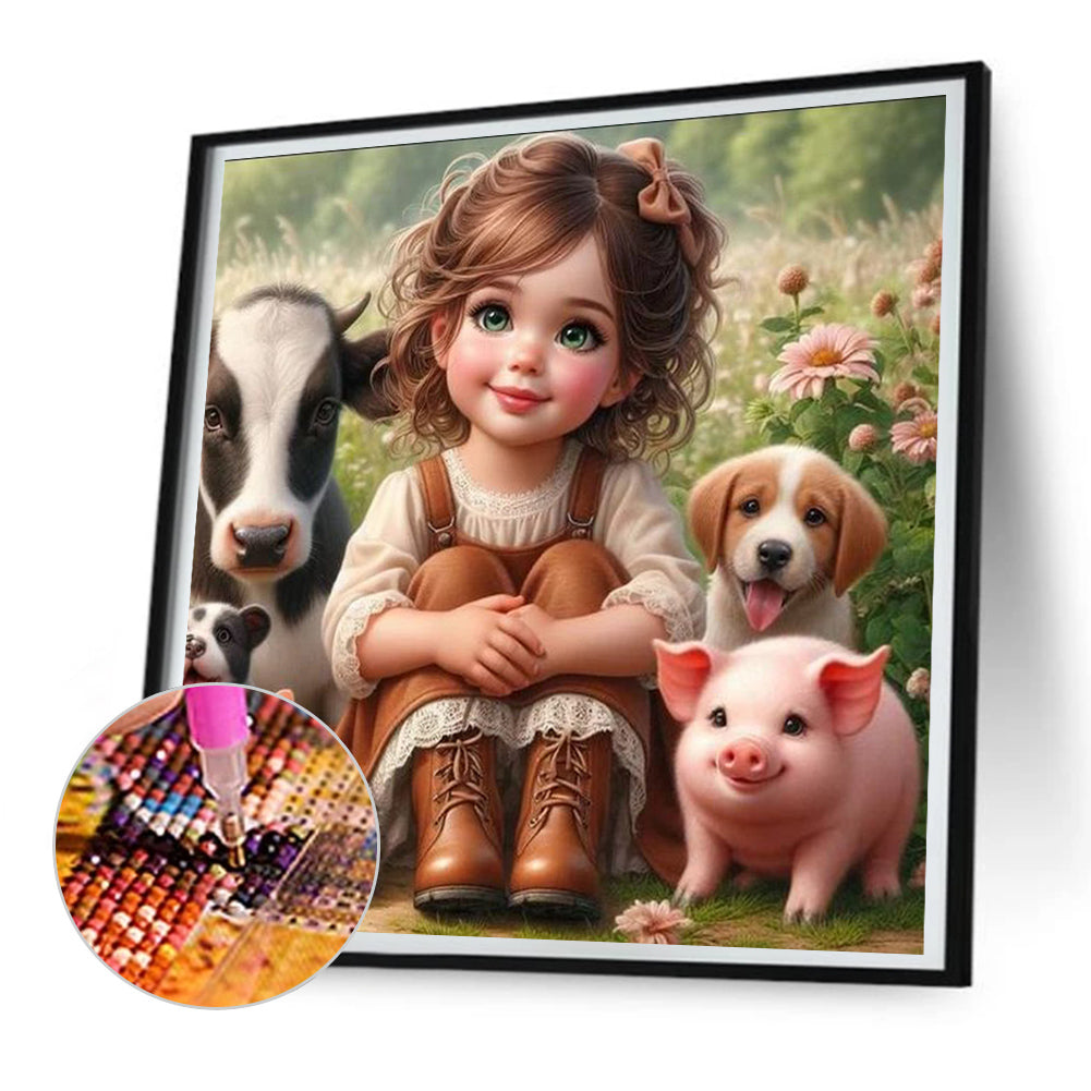 Diamond Painting - Full Round - Kitten, puppy, piglet, calf girl (30*30CM)