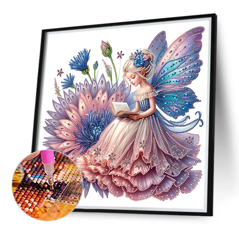 Diamond Painting - Partial Special Shaped - pink purple chrysanthemum reading butterfly girl (40*40CM)