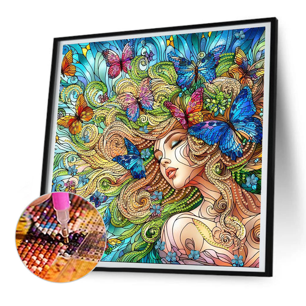 Diamond Painting - Partial Special Shaped - Sleeping girl with beautiful butterfly glass art (30*30CM)