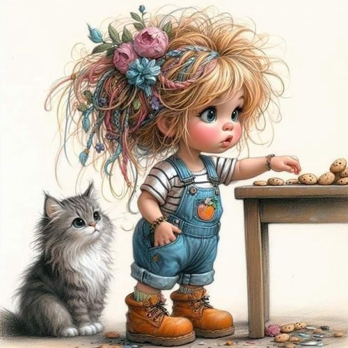 Diamond Painting - Full Round - Girl with biscuits and kitten (40*40CM)