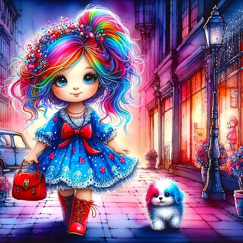Diamond Painting - Full Round - Colored-Haired Girl And Colorful Puppy (30*30CM)