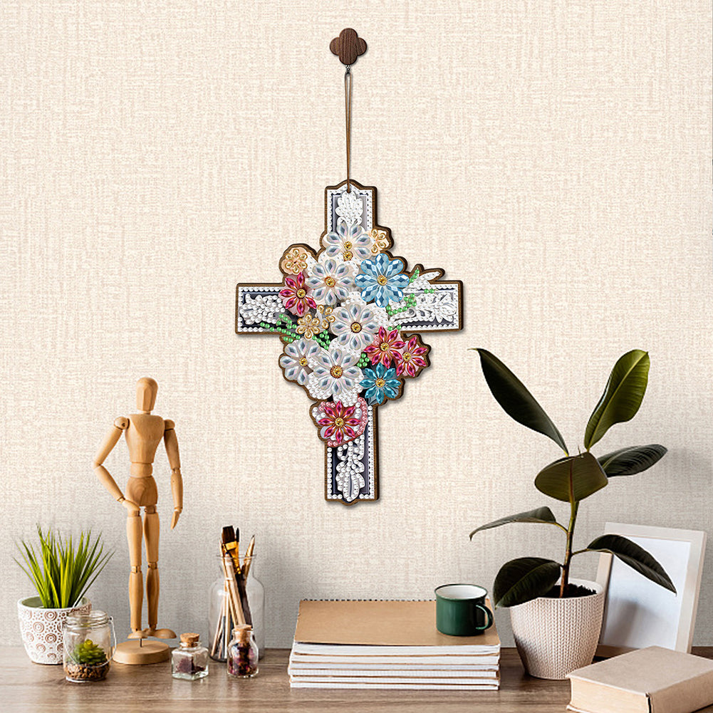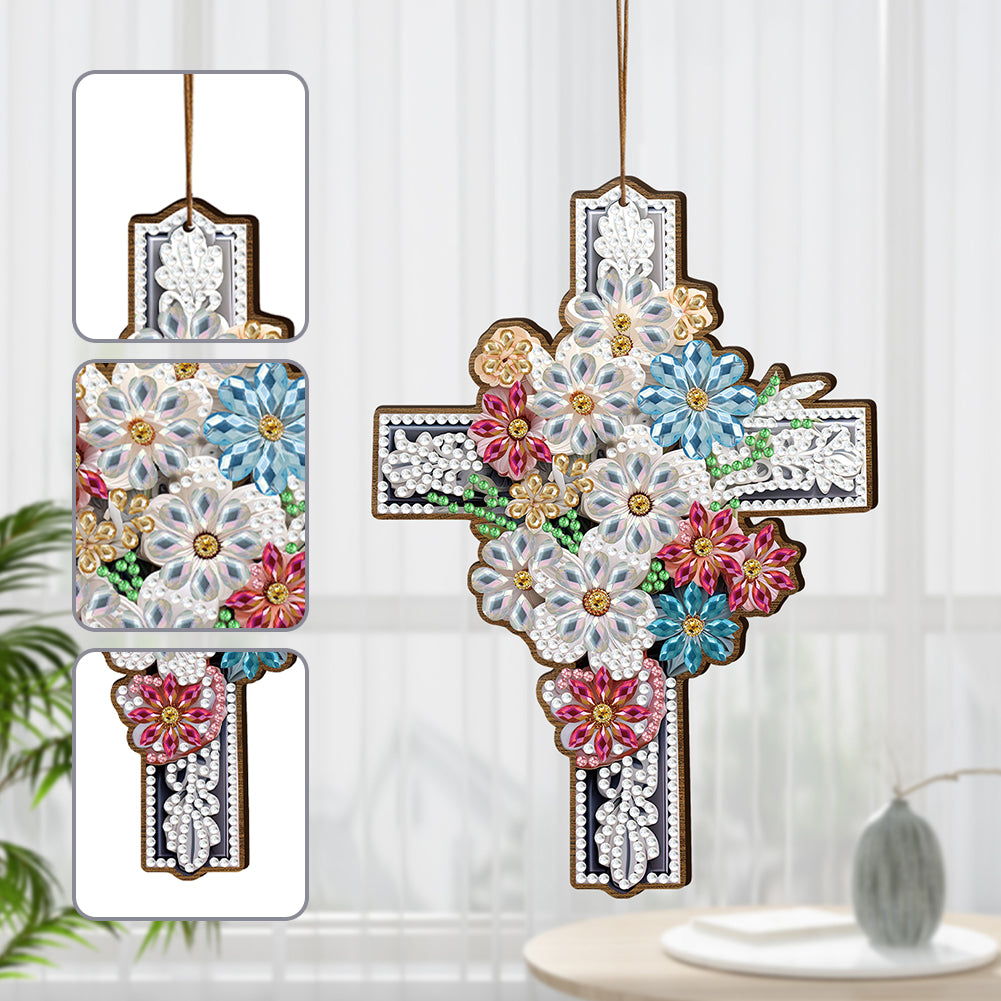 Wooden Cross 5D DIY Diamond Painting Hanging Pendant for Garden Window Decor(03)