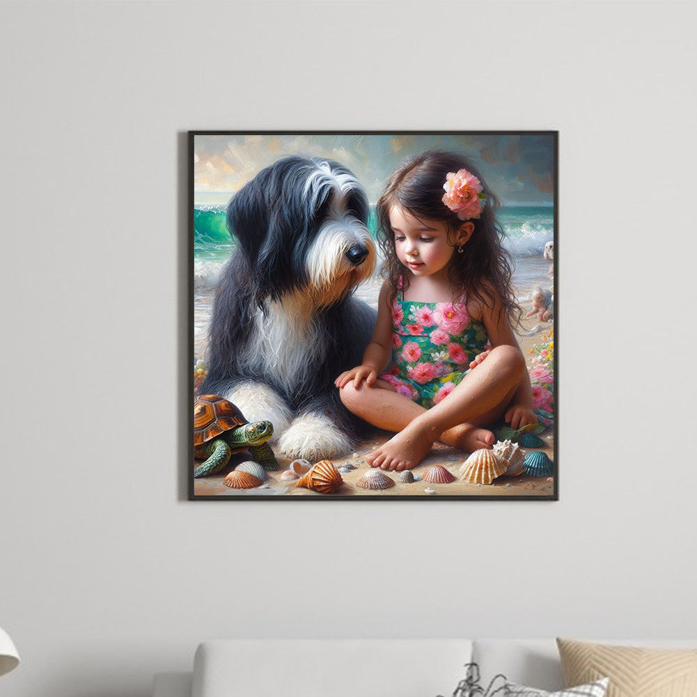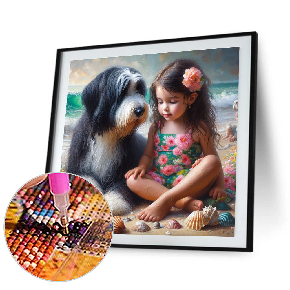 Diamond Painting - Full Square - Girl and dog at the beach (30*30CM)