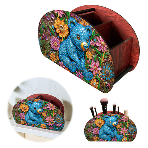 DIY Blue Bear Design Wooden Diamond Painting Makeup Brush Storage Box Organizer